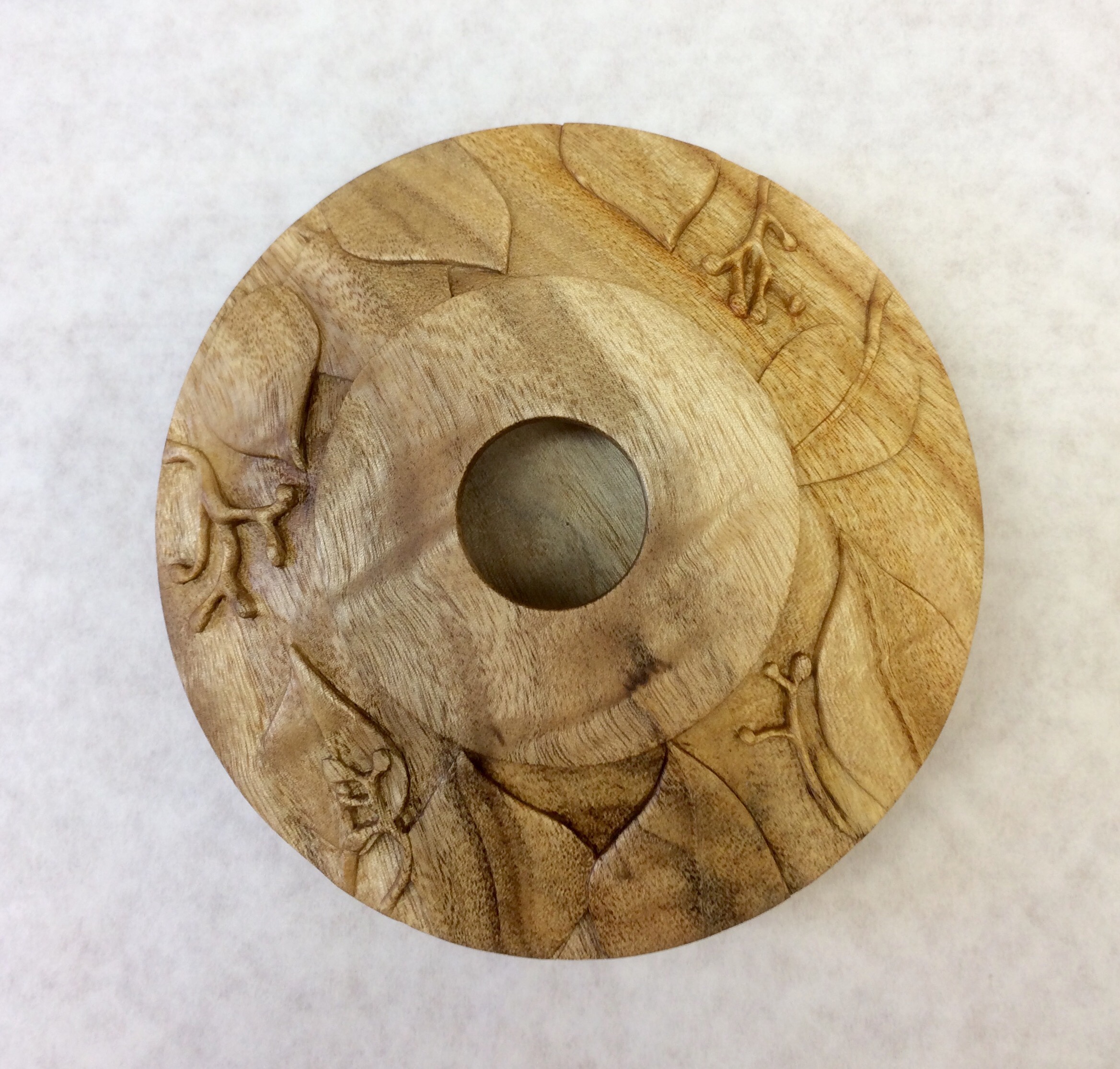 Back in 2017 I visited Australia and through the wonders of the internet and woodturning community was able to visit clubs in Sydney and Brisbane. My Australian hosts were more than hospitable, going out of their ways to show me around, introduce me to their clubs and give me samples of wonderful wood. I turned my first camphor laurel lidded vessel in Australia, in my friend’s woodshop complete with a possum in the roll-up garage door! The aroma was intoxicating and the wood-simply divine! By the time I got the piece back to Arizona, the dry wood dried some more so the opening was no longer true and changed color. I decided to re center the opening, turn a finial and carve the upper surface with camphor laurel design