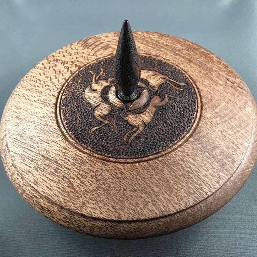 Another beautiful timber I received from club members in Australia was a piece of “pink silky”. It’s grain pattern resembles oak, but once turned has this beautiful pink hue under certain light. To honor this wood I turned a wide mouthed lidded vessel so that the chatoyance effect of color shifts could be seen on the inside. I wood-burned an ancient three rabbit design into the lid. This motif appears in many ancient contexts ranging from a Celtic trinity to a symbol of fertility. It is believed that the symbol migrated west via the Silk Road from the orient.