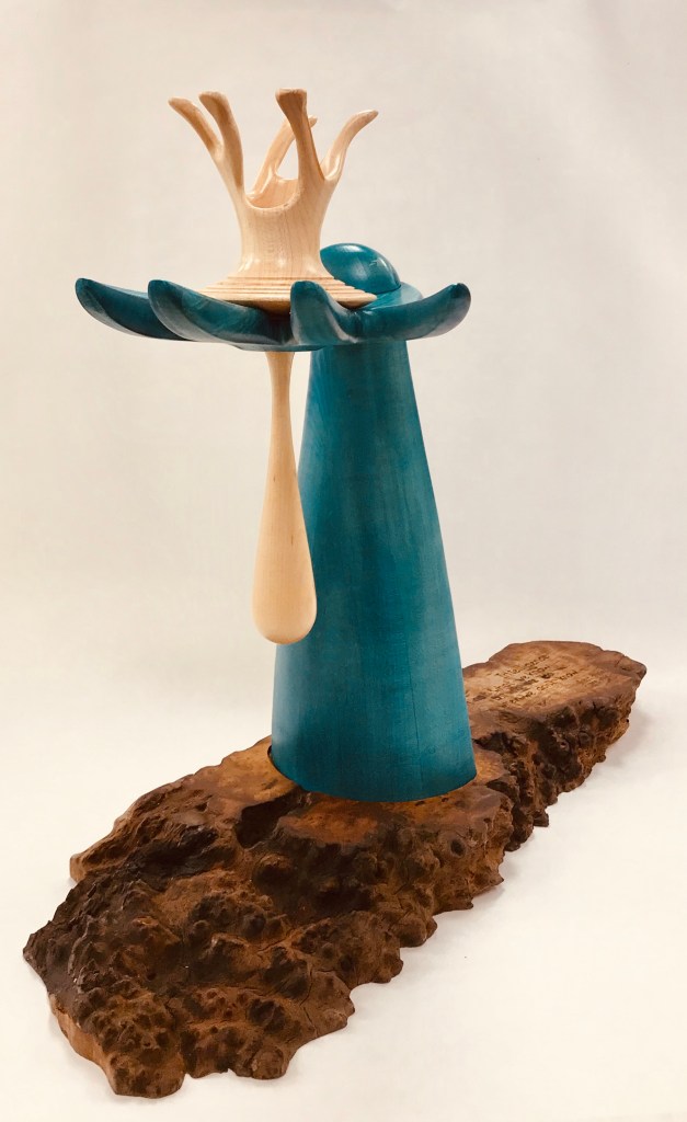 Water has become an obsession. I strive to understand the dynamics of sustainability in an area with an 11″ average rainfall per year. ” Intelligence” was the first completed sculpture and was created in January 2019 in response to a call to artists by the Tubac Presidio which, in turn, was sponsoring the Smithsonian Water Ways traveling exhibit. It introduces the up-thrusting hand reaching for the last raindrop. The caption on the base is a quote from Piaget: “Intelligence is not what we know, but what we do when we don’t know”.