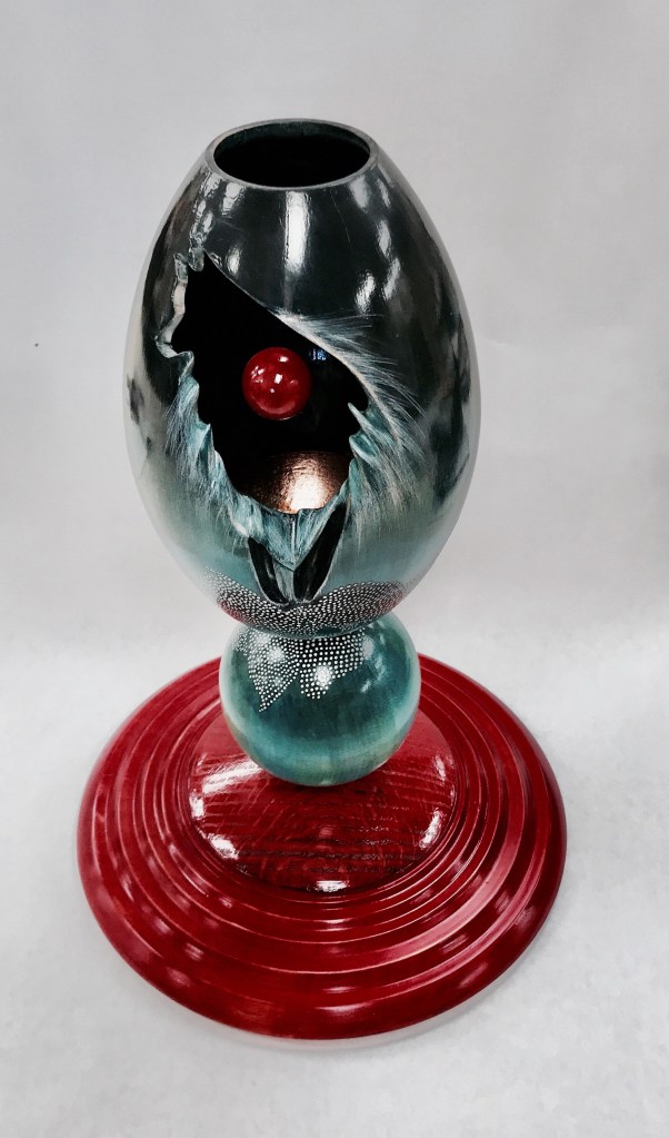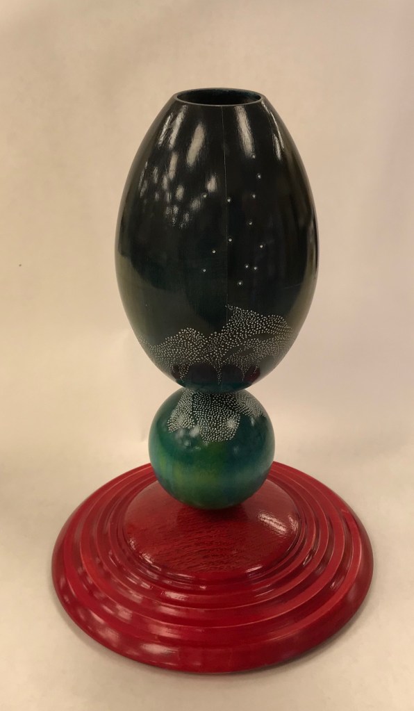 D:10”, H:14.5”. Turned, carved and wood burned. Hard maple and quarter sawn oak, aniline dyes, copper leaf and liming wax