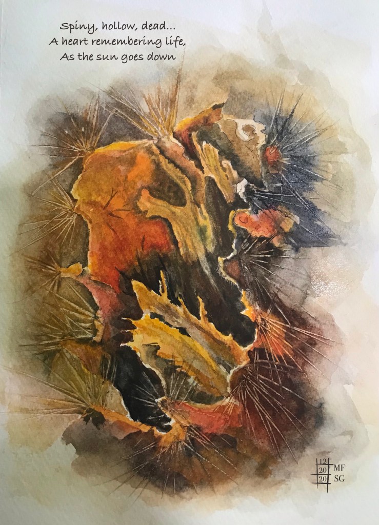 Walking in the desert as sunset approaches is a magical time. Dead chollas glow as the late sun penetrates their thorny skeleton. I stood for a while marveling at their “aliveness”. I dreamt of being able to capture the moment. Words as well as images flooded my brain. I conjoured with words all the way home. Juggling reality, emotion and timefulness. As soon as I got home I scribbled words in my sketch book and let the thought of painting incubate for a while.